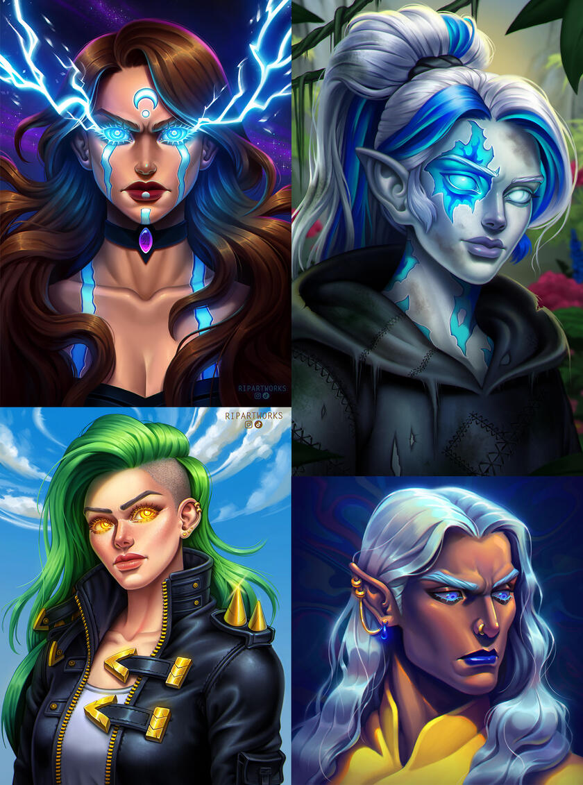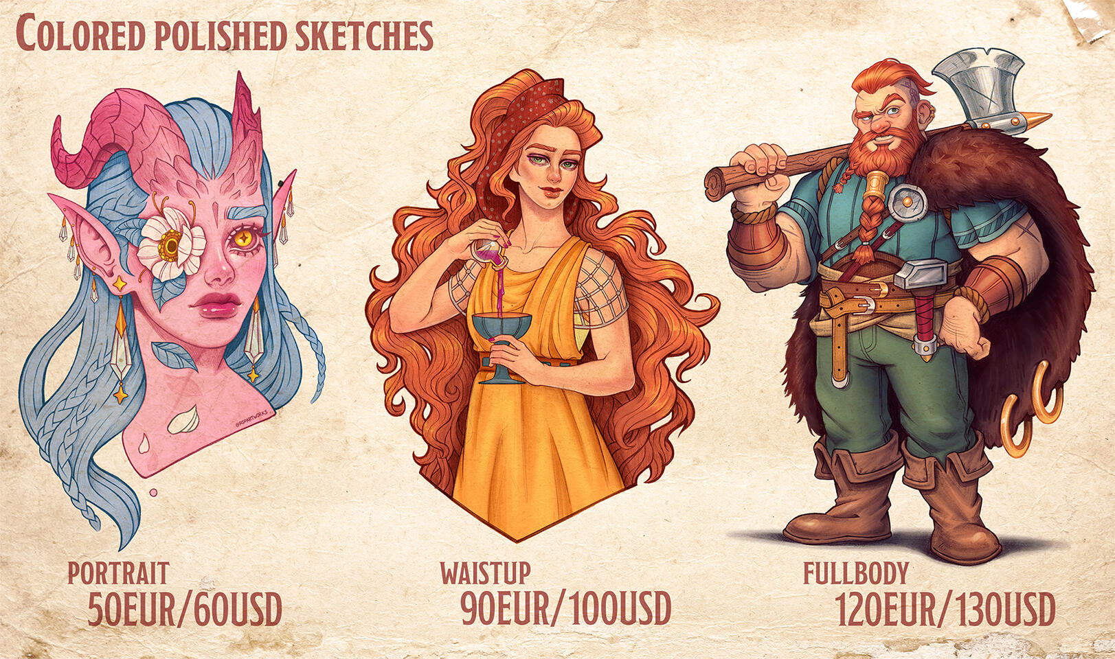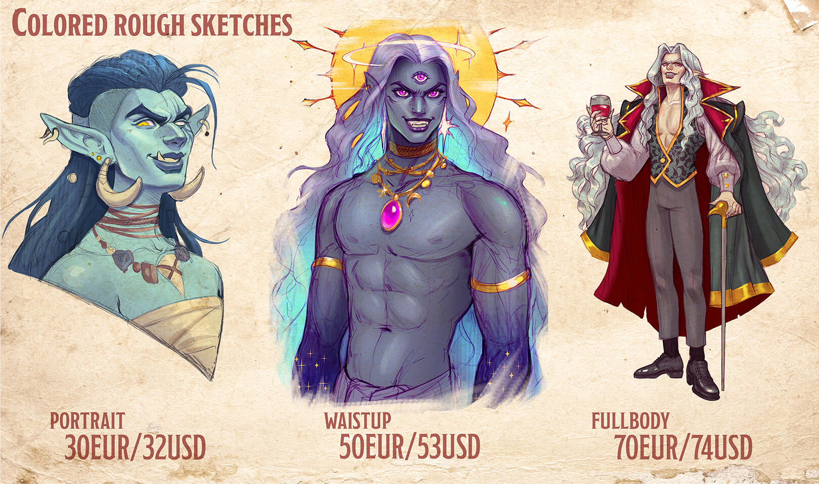 You don't have to have previous artwork of the character done. I can work only from a reference board and written description. If you have only an idea for the character, I can go from there too, BUT for a small additional fee. I'm experienced with fantasy, sci-fi, anthro and animal characters. I work in a semi-realistic style, like the shown examples. Click the blue button below and fill the Google Form to order! :)