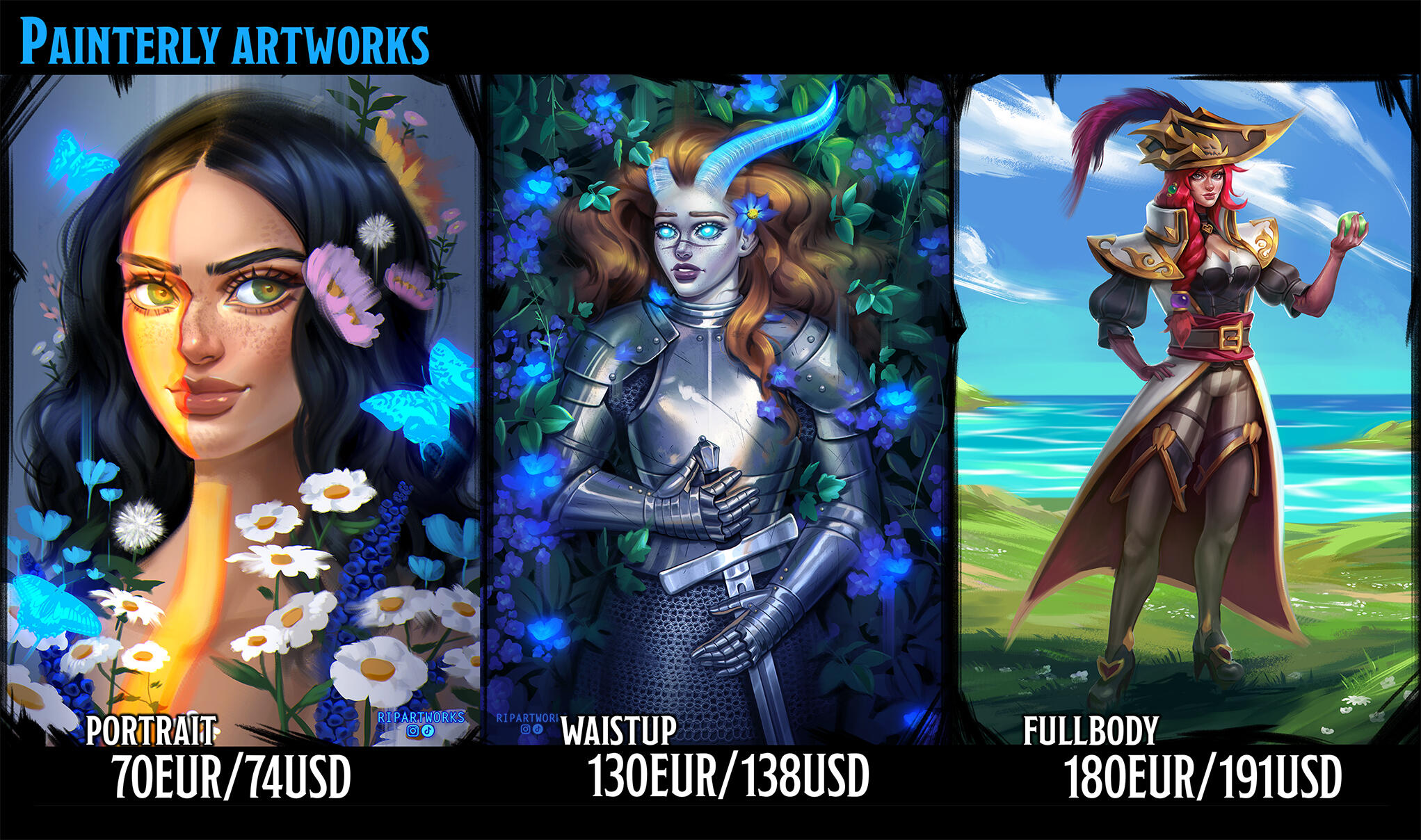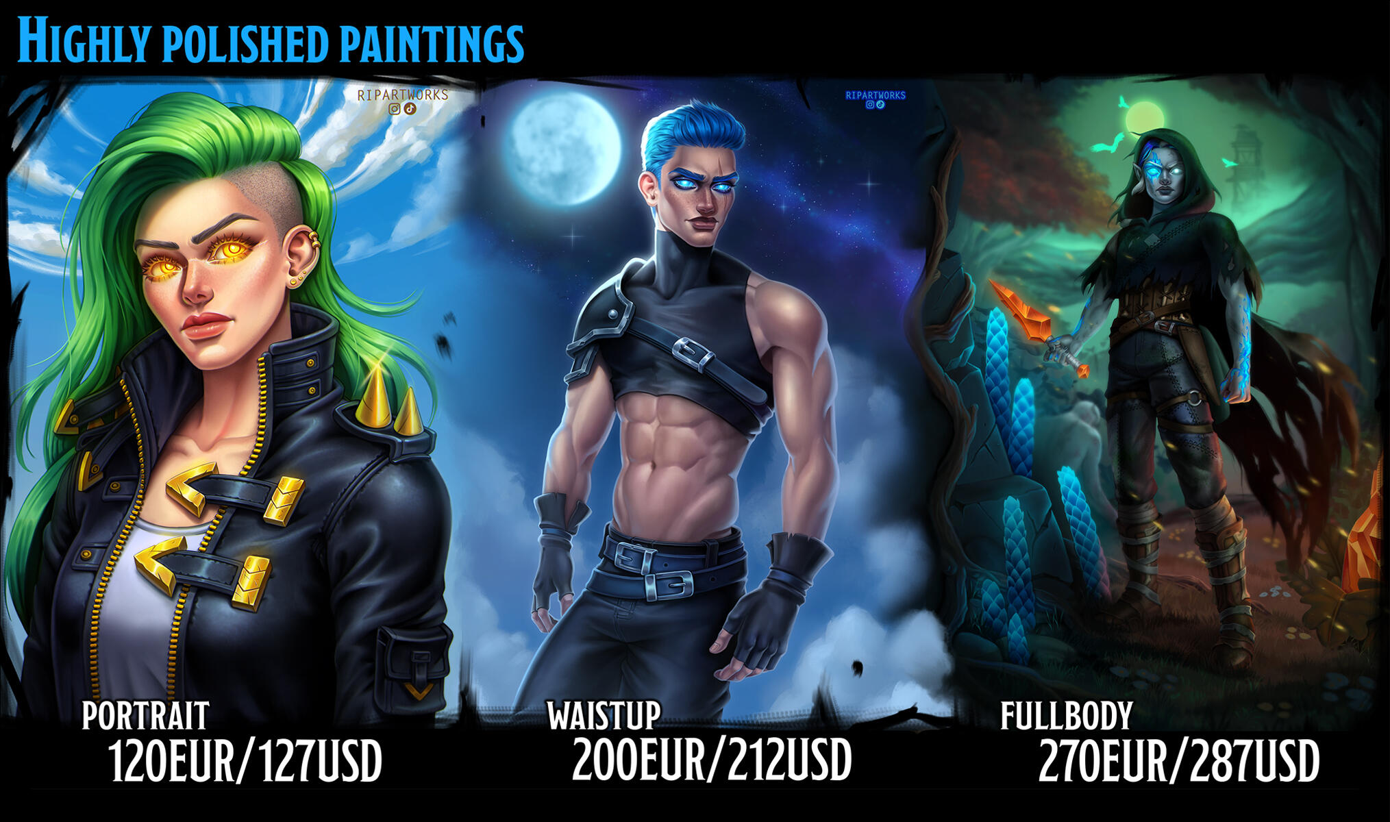 These paintings have a more chaotic vibe. They are done without using lineart, with a lot of brushstrokes and stamps. Detail is added mainly to the face, whereas the rest is left in a rougher state. Along with the finished piece you'll recieve high resolution files of all the WiPs and a timelapse. Simple backgrounds are free! Additonal characters cost 90% of the base price. Further discounts available for big projects.Completion time: 4 to 8 business days.