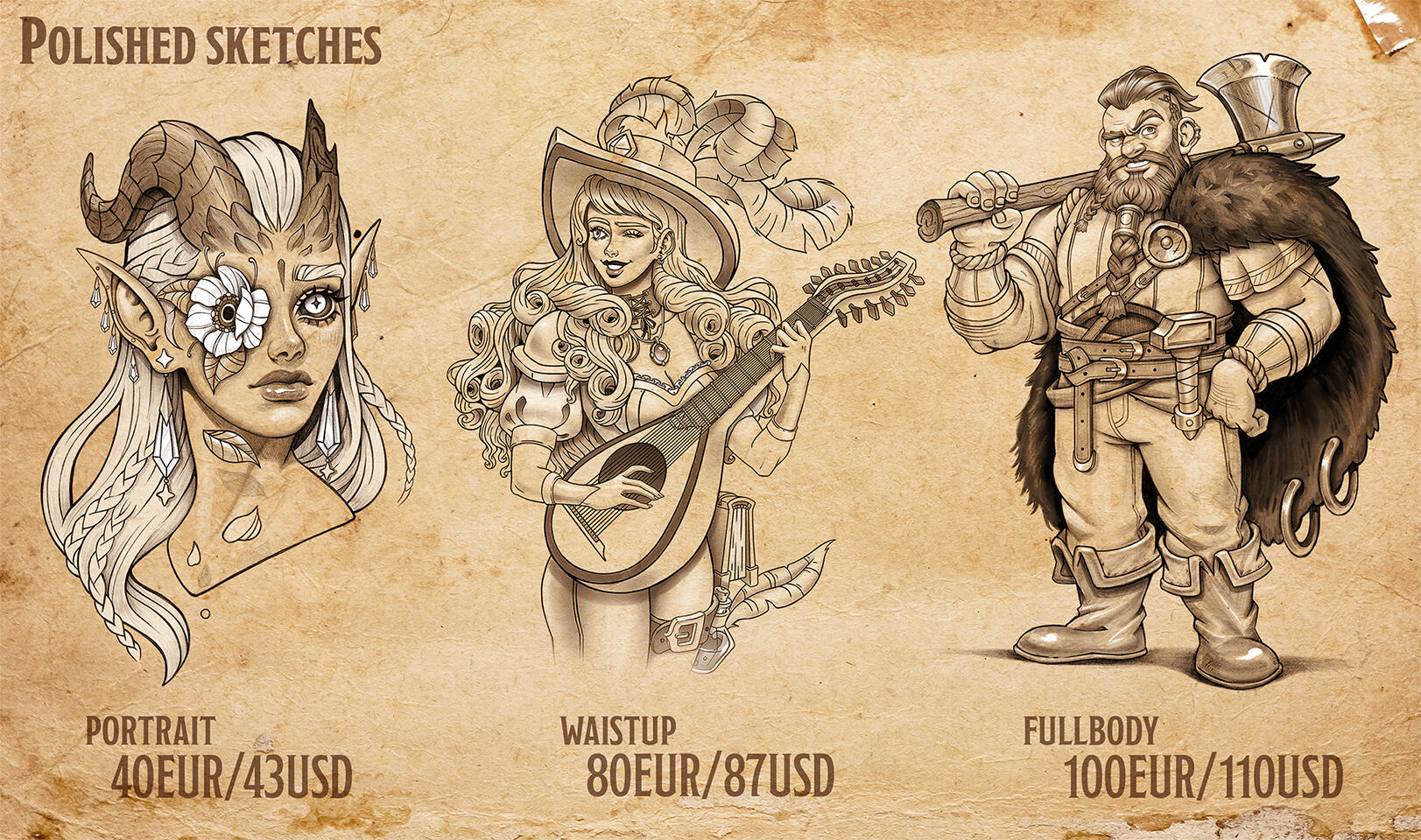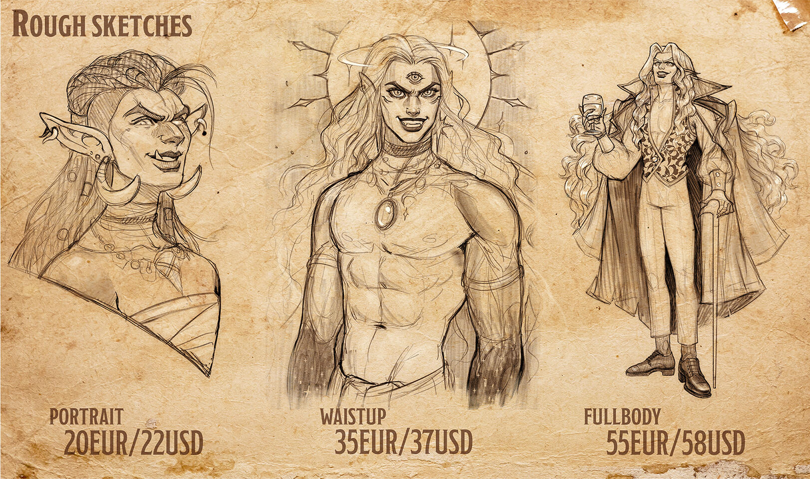 Polished sketches with a wanted poster vibe, an upgrade of the previous category - perfected lineart and added shading. Along with the finished piece you'll recieve high resolution files of all the WiPs and a timelapse. Additonal characters cost 90% of the base price. Further discounts available for big projects.Completion time: 2 to 5 business days.